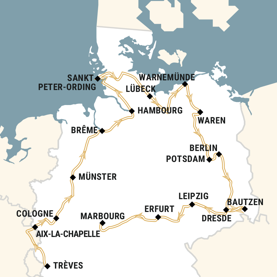 Découvrez l’Allemagne lors d’un circuit de 26 jours à travers ses villes emblématiques et ses paysages uniques. De Trèves, Cologne et Hambourg jusqu’à Berlin, Dresde et Leipzig, partez sur les traces de l’histoire, entre vestiges romains, héritage médiéval et patrimoine de l’Unesco. Balades en bateau, dégustations de vins, visites guidées et escapades nature rythmeront ce voyage riche en découvertes. Un itinéraire complet alliant culture, charme des villes hanséatiques et paysages grandioses pour une immersion inoubliable au cœur de l’Allemagne.