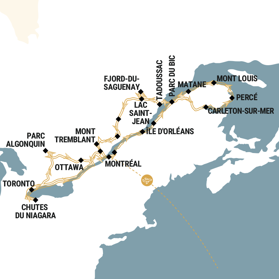 Découvrez le Canada en 30 jours, de Montréal à la Gaspésie. Visitez Montréal, Toronto, Ottawa et Québec avec leurs monuments emblématiques et quartiers historiques. Admirez la nature grandiose : Chutes du Niagara, parcs nationaux, fjords et lacs. Participez à des expériences authentiques : cabane à sucre, artisanat, homard frais et observation des baleines. Un voyage mêlant liberté, confort et découvertes pour un séjour canadien inoubliable.