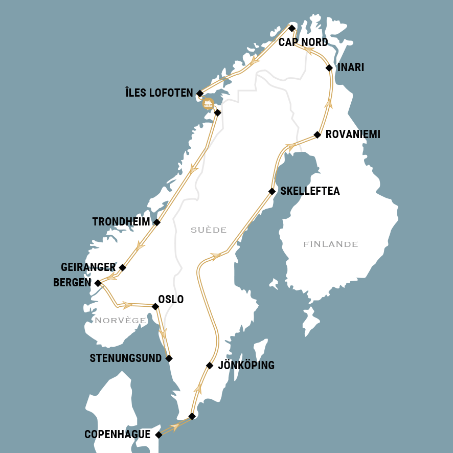 Ce circuit de 36 jours vous emmène de Rostock vers la Scandinavie à travers la Suède, la Finlande et la Norvège. Vous traversez de grands lacs, fjords majestueux, glaciers et cascades, jusqu’au mythique Cap Nord et le cercle polaire. Les étapes mettent en valeur la culture locale : villages saami, élevages de rennes, églises en bois, musées vikings et villes historiques comme Bergen, Trondheim et Oslo. De nombreuses croisières, randonnées et moments libres permettent d’admirer paysages et soleil de minuit. Un voyage complet, alliant nature sauvage, patrimoine et convivialité, avant un retour en Suède.