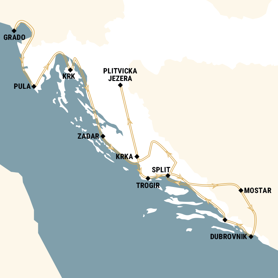 Un circuit de 22 jours entre l’Italie, la Croatie et la Bosnie, débutant à Grado avec accueil des équipages. Découverte de l’Istrie, des îles croates (Krk, Pag), puis des grandes villes dalmates : Zadar, Split et Trogir. Excursions nature dans les parcs nationaux de Krka et Plitvice, avec cascades et lacs turquoise. Étapes culturelles à Mostar et Dubrovnik, entre patrimoine UNESCO et traditions locales. Le voyage alterne visites guidées, balades en bateau, moments de détente et nuits en camping.