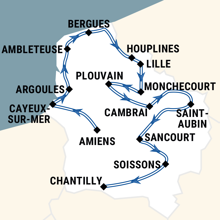 Un voyage de 16 jours à la découverte des richesses culturelles et gourmandes des Hauts-de-France, débutant à Amiens. Le parcours explore la côte d’Opale, la baie de Somme, les caps Gris et Blanc-Nez, ainsi que Lille et ses quartiers typiques. De nombreuses visites guidées et thématiques jalonnent le circuit : musées miniers, mémoire de la guerre, patrimoine médiéval, confiseries et fromageries. Les soirées alternent entre campings et bivouacs à la ferme pour une immersion locale. Le voyage s’achève en beauté au Château de Chantilly avec visite, spectacle équestre et déjeuner de fin de circuit.