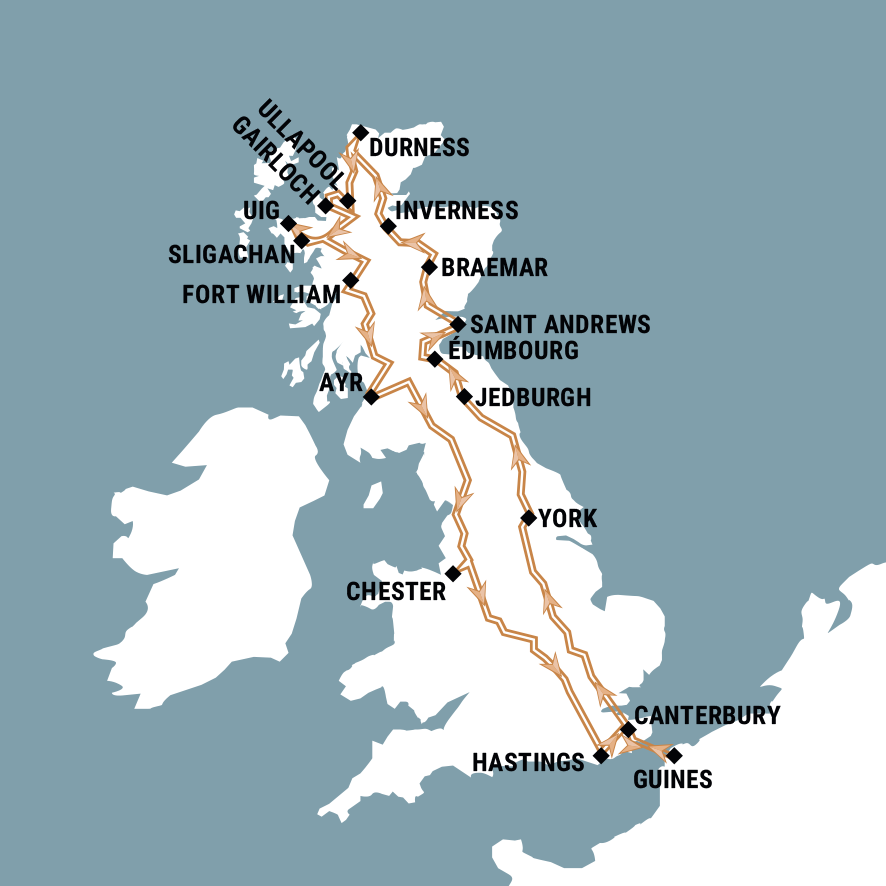 Un voyage de 26 jours à travers l’Écosse et le nord de l’Angleterre, entre villes historiques et paysages sauvages des Highlands. Découverte des capitales culturelles : Édimbourg, York, Canterbury et Chester, avec visites guidées et temps libre pour flâner. Immersion dans la nature écossaise : Loch Ness, île de Skye, Ben Nevis, Highlands et panoramas côtiers spectaculaires. Expériences uniques : trains historiques, distilleries de whisky, châteaux, croisières sur lochs, et gastronomie locale.