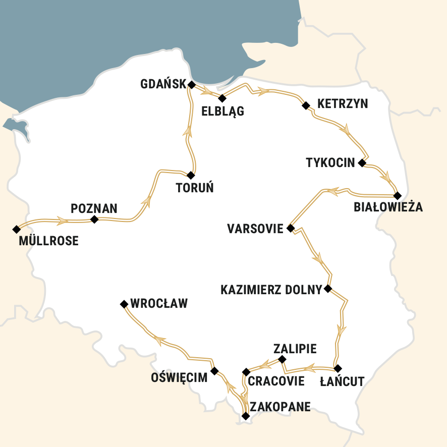 Un périple de 27 jours qui débute près de Berlin avant de plonger au cœur de la Pologne historique et culturelle. Découverte des grandes villes : Poznań, Toruń, Gdańsk, Varsovie, Cracovie, Zakopane et Wrocław, avec plusieurs visites guidées. Immersion dans le patrimoine : château de Malbork, mine de sel de Wieliczka, skansen de Sanok, monastères, synagogues et églises en bois. Moments forts : Białowieża et sa forêt primaire, la descente du Dunajec en radeaux, un dîner folklorique montagnard, et la visite poignante des camps d’Auschwitz-Birkenau. Un circuit riche en histoire, nature et traditions, mêlant culture, mémoire et convivialité au fil des paysages polonais.