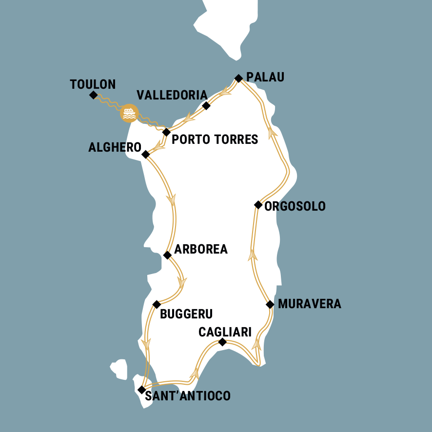 Ce voyage débute à Toulon avec une traversée de nuit vers Porto Torres, puis découverte des plages turquoise de Stintino et de la charmante ville d’Alghero. L’itinéraire conduit ensuite vers la Sardaigne profonde avec ses villages pittoresques, les sites archéologiques nuragiques comme Tharros et Su Nuraxi, ainsi que le parc de la Giara et ses chevaux sauvages. La côte sud révèle Sant’Antioco, les grottes d’Is Zuddas, le site antique de Nora et la capitale Cagliari. En remontant la côte est, les paysages spectaculaires d’Arbatax, Orgosolo et ses fresques murales, ainsi que les montagnes du Supramonte dévoilent une autre facette de l’île. Enfin, le circuit se termine dans le nord avec l’archipel de la Maddalena, Castelsardo et Capo Testa avant de reprendre le bateau vers Toulon.