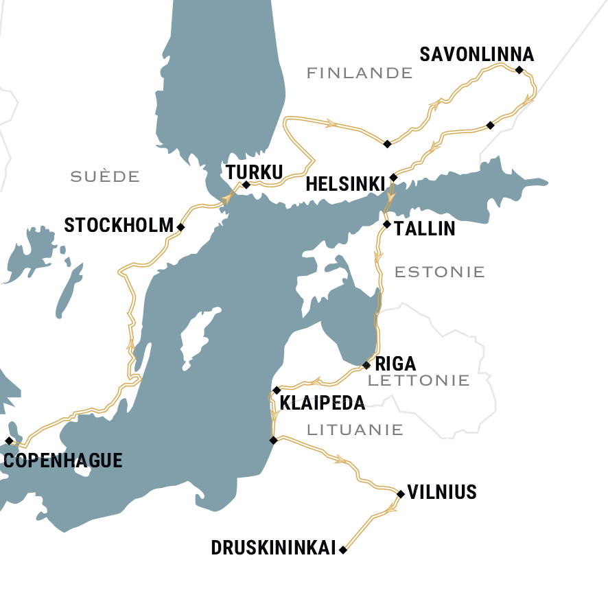 Le voyage débute à Copenhague, puis traverse le sud de la Suède avec Kivik et l’île d’Öland avant de rejoindre Stockholm. Découverte de la Finlande avec Turku, Riihimäki et Savonlinna, incluant la région des Mille Lacs, musées et châteaux médiévaux. La route se poursuit vers Helsinki avec visite guidée et temps libre, avant une traversée en ferry jusqu’à Tallinn en Estonie. Exploration des pays baltes : Riga en Lettonie, Klaipeda et l’isthme de Courlande en Lituanie, avec paysages côtiers et villages typiques. Dernières étapes vers Trakai et Druskininkai, incluant Vilnius et le château de Trakai, pour une conclusion culturelle riche avant le départ.